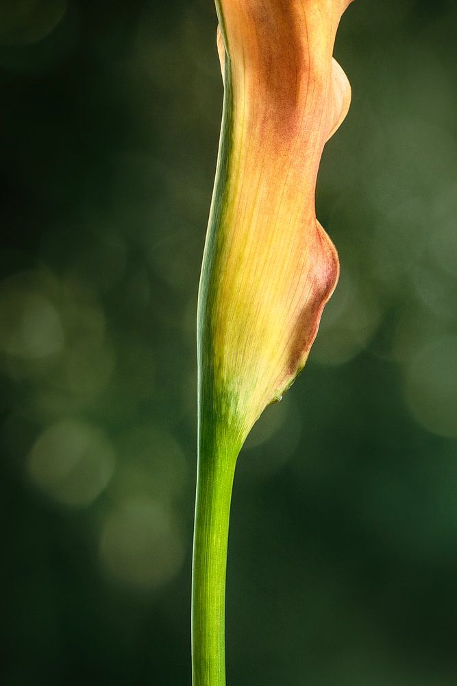 Calla flower photographed from the side with bokeh in the background. Flowers always bring peace, it brings nature into your home. Because the lightest part in the photo is in the centre and there are no distracting elements in the picture, it attracts attention.