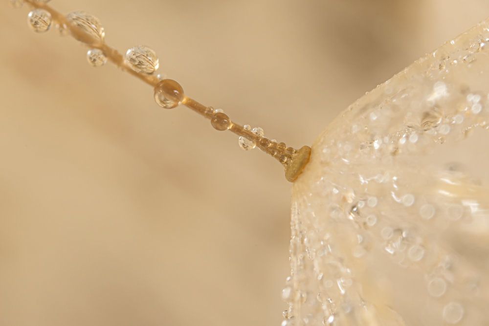 "Calm soft pastel colours: Close-up of droplets on a fluff of a dandelion" is a macro photo of a small fluff on a dandelion. In the background, you can still vaguely see the lines of the other fluff on the dandelion's fluff ball.