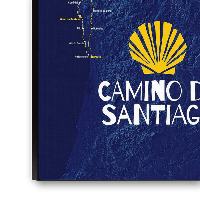 The Camino de Santiago as a decorative poster. An overview of the various routes: Camino Frances, Camino Portugues, Camino Primitivo, Camino del Norte and Via de la Plata. Stylish design map for pilgrims – also a great gift idea!