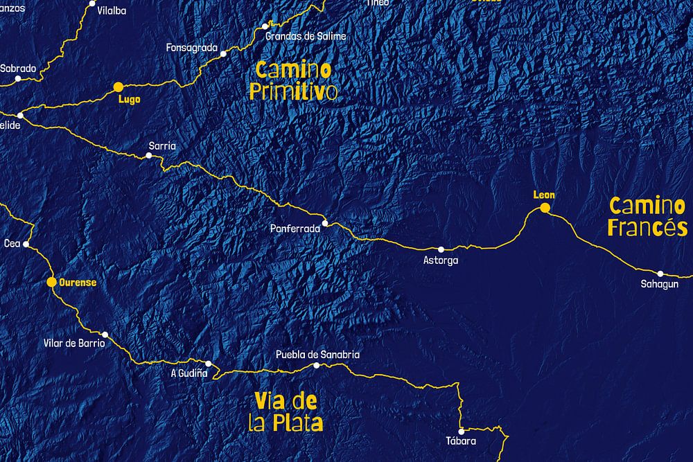 The Camino de Santiago as a decorative poster. An overview of the various routes: Camino Frances, Camino Portugues, Camino Primitivo, Camino del Norte and Via de la Plata. Stylish design map for pilgrims – also a great gift idea!