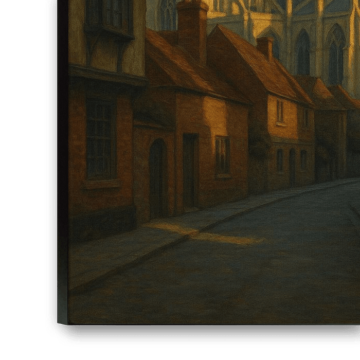 Canterbury Twilight Serenity captures the timeless grace of one of England’s most historic cities, bathed in the soft gold of evening light. The cathedral rises with quiet majesty above winding streets, its ancient stones glowing under the fading sun. The world below stands still, wrapped in a calm that feels both sacred and cinematic. This artwork, inspired by Edward Hopper’s emotional realism, transforms architectural grandeur into a meditation on stillness, solitude, and the beauty of gentle light.