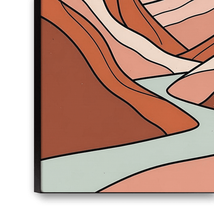 This captivating artwork invites you on a journey through a serene canyon landscape, rendered in a striking modern illustrative style. Layers of earthy tones, from deep terracotta and rich rust to soft blush and creamy beige, form the majestic rock formations that frame a tranquil turquoise river, gently winding its way through the…