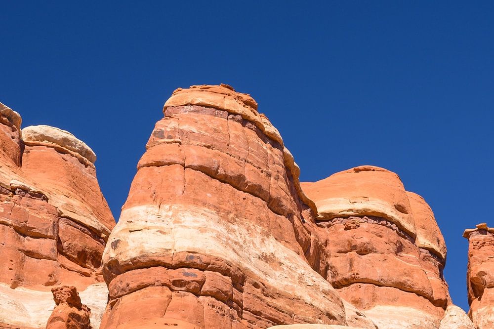 The landscape around us was unreal beauty. The needle-shaped rock formations, from which this part of Canyonlands takes its name, stood out sharply against the steel-blue sky. The colours of the sandstone seemed even more intense in the bright light: red, orange and ochre yellow, as if they were on fire. Every detail of the landscape was enhanced by the heat, as if nature wanted to show how vibrant it could be, even in these harsh conditions.