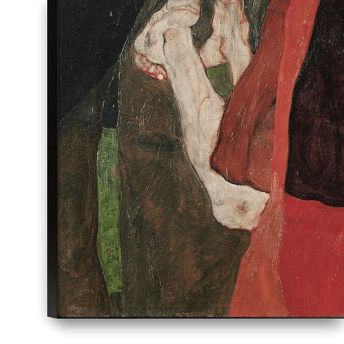 An arousing subject has been placed into the confines of a strict formal system – its expressiveness inseparable from its constructed quality. The nude legs of the figures appear almost garish as they protrude from the nun and cardinal’s garments and seem to indicate that neither conventions nor taboos can restrain their basic instincts. The shocked expression on the nun’s face bears a remarkable resemblance to Schiele’s Self-Portrait with Raised Bare Shoulder of 1912. On the other hand, the cardinal’s naked legs seem to directly quote from an earlier watercolor showing Schiele’s companion Wally Neuzil kneeling with her bare legs on the floor. Therefore, it seems that Schiele intended to apply his and Wally’s identities to the cardinal and the nun, albeit in reversed roles. As the painting was originally entitled Caress, and the motif depicts a man lovingly embracing a kneeling woman, one is led to believe that Schiele was paraphrasing Gustav Klimt’s famous painting The Kiss. Quite conversely, however, he replaced Klimt’s gilded harmony with a suspense-packed convergence of polar oppositions that is supported by the contrasted color pairings of the scandalous red and a deep black.