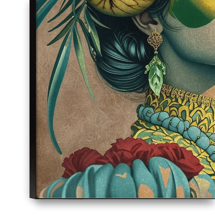 The picture shows a surrealistic composition of a woman from the Caribbean region, whose head is crowned with a lavish headdress made of fruits, leaves and flowers. Her face is artfully painted with bright shades of green, yellow and orange, her eyes are closed and her lips are vividly coloured.