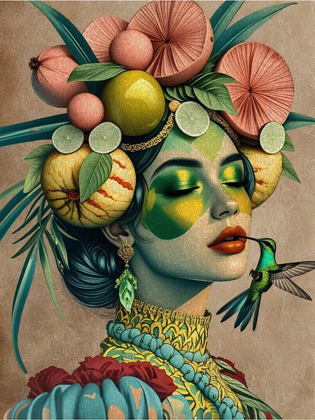 Buy this digital art artwork Caribbean muse with hummingbird by Sandu Brus ARCANE ART STUDIO as a reproduction on canvas, ArtFrame, poster and wallpaper, printed on demand in high quality.