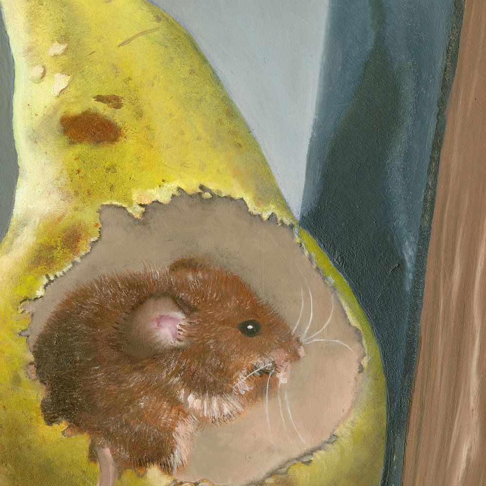 In Book Mouse, Carla Jasper combines charm and detail to create a scene straight out of a storybook. A tiny mouse has made its home inside a ripe pear, nestled between well-loved books, as if pausing to listen to the stories that surround it. The warm tones of fruit and fur contrast with the solid presence of the books, capturing both whimsy and quiet intimacy. This painting speaks of curiosity, shelter, and the little surprises that life offers when we look closely. Playful yet refined, it highlights the artist’s ability to bring imagination into realism. Part of the TAM Master Students collection, this work invites us to see the extraordinary in the everyday.