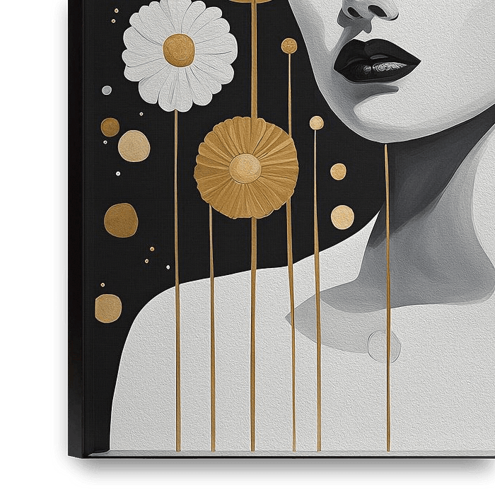 Designed as an eye-catcher for your home, this striking artwork depicts an elegant portrait of a woman interwoven with captivating geometric shapes and golden yellow flowers. Her facial features are highlighted by the clean lines and shapes around her, while the flowers add a soft and organic touch to the whole. The combination of…