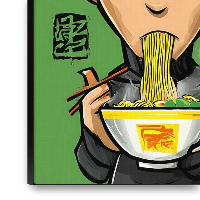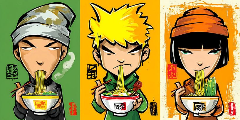 Three stylized cartoon figures enjoy bowls of ramen