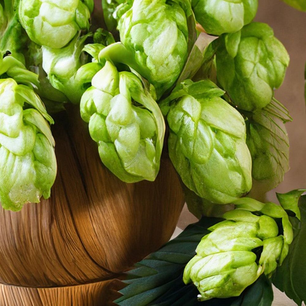 The hop Cascade plant stands proudly in a simple pot, its lush, green branches swing playfully upwards, forming a vibrant, natural wall. The leaves are fresh and bright in colour, with a subtle sheen that catches the sun. Along the tendrils hang the distinctive hop cones, hanging like green gems among the foliage. They have a delicate, cone-shaped structure, slowly ripening, ready to reveal their characteristic aroma and flavour. The pot, modest but sturdy, gives the hop plant room to develop and thrive, while the cascade of leaves and bubbles exudes a sense of dynamism and growth. The whole thing is a visual symbol of nature's strength and vitality, captured in a small, controlled piece of environment.