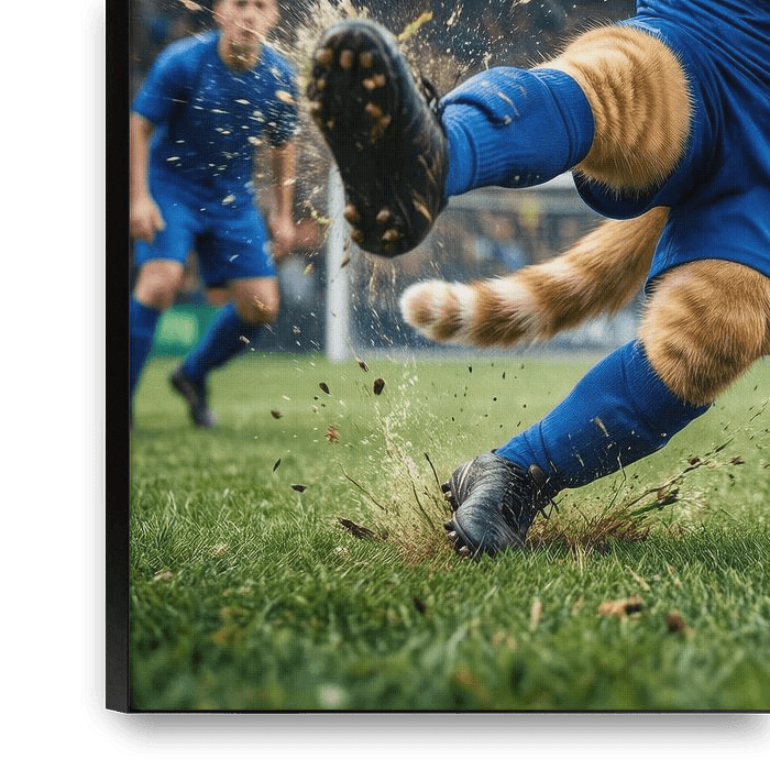 Buy this digital art artwork Cat Kicking Soccer Ball In Stadium by Matthias Hauser as a reproduction on canvas, ArtFrame, poster and wallpaper, printed on demand in high quality.