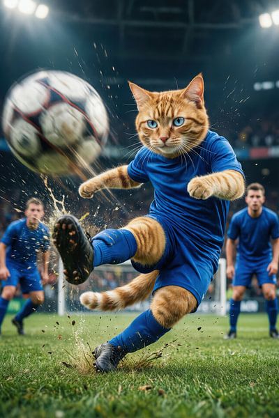An orange tabby cat in a bright blue soccer kit drives a powerful kick across the grass as a blurred ball flies past under stadium lights. The low angle and flying turf make the action feel immediate and intense.