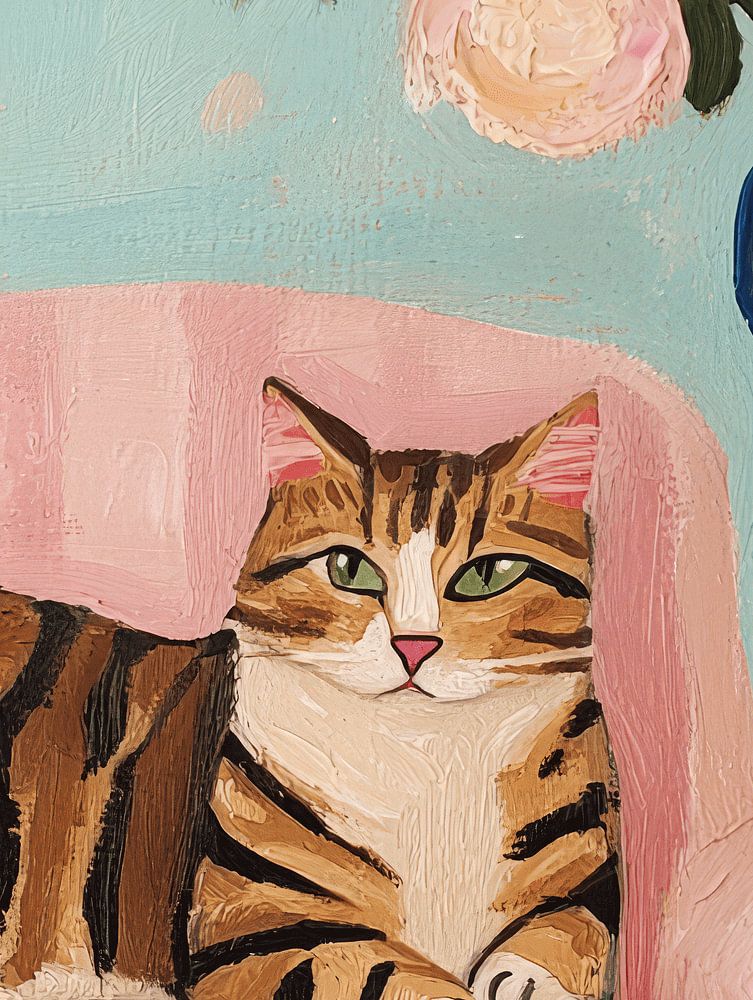 This painting exudes ultimate cat happiness. A cat, clearly in her most zen-like slumber, lies comfortably on a soft chair. The flowers in the background seem to dream along, as silent witnesses to this siesta. With that relaxed posture, this cat shows how to live life at its best: lounging, surrounded by flowers and pretty patterns.