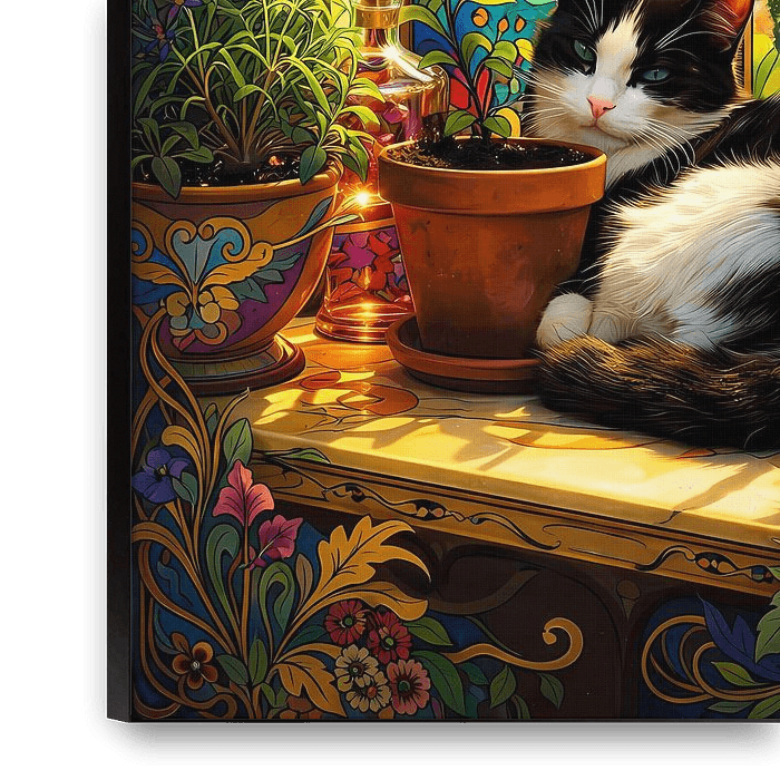 A black and white cat made himself comfortable in the sunny versnter bench, amidst the plants.
