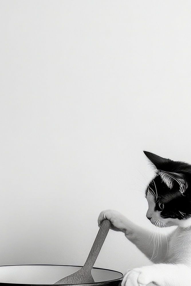A curious house cat stands on its hind legs and eagerly examines a boiling pot. The monochrome aesthetic gives the picture a timeless charm. Perfect for the kitchen, it brings a touch of playful elegance and brings a smile to every viewer, while heightening the anticipation of culinary adventures.