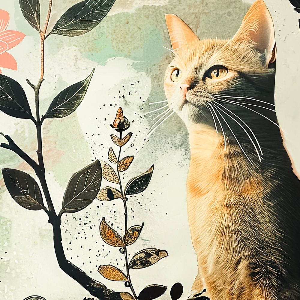 A collage of an orange cat in the garden. The background is richly detailed with branches, leaves and colourful flowers. This artwork combines the beauty of nature with the elegance of a cat, perfect for modern interior decoration and lovers of cats and botanical art.