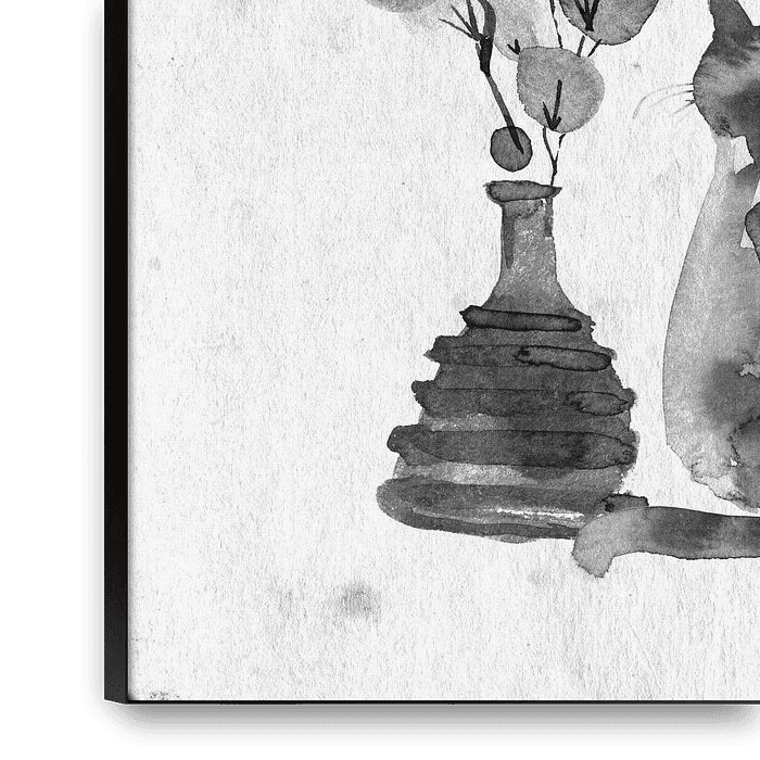 Japanese ink painting of a black cat next to a vase of flowers enjoying the sun.
