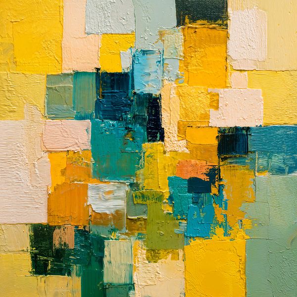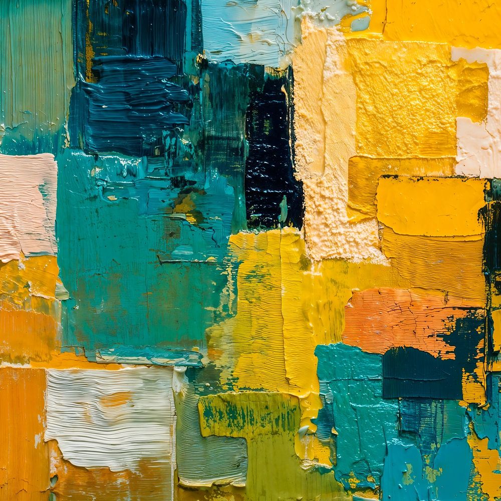 An abstract painting with a mosaic of rectangular blocks and shapes. The brushstrokes are visible and impasto, creating a sense of depth and dimensionality. The composition appears dynamic and somewhat chaotic, with the blocks overlapping and intersecting in an asymmetrical arrangement. The light seems to come from within the painting,…