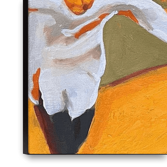 A dance of joy by three brothers in the hills, overlooking the mountains. The original work was created with acrylic and oil on canvas, inspired by archive photography. The warm, yellow pop colour emphasises the cheerfulness of the scene.
