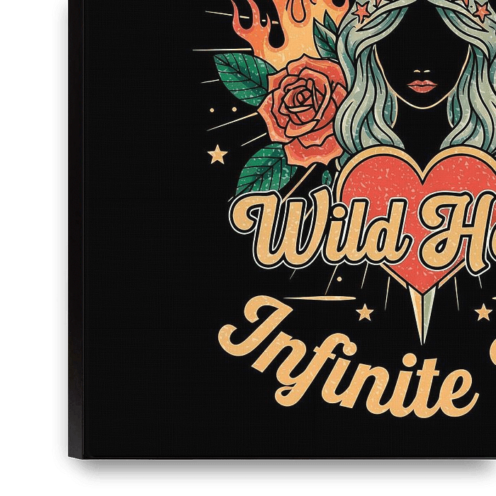 This captivating artwork portrays a powerful female figure in a bold, illustrative style, echoing vintage tattoo art or mystical tarot. Her mysterious silhouette features vibrant hair with a star-studded crown, hinting at celestial origins. Flames and roses flank her, symbolizing passion. A sword suggests strength; a prominent heart…