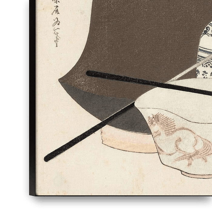 Still life with teapot, a porcelain pot with a lid and a cup with a galloping horse on it. The iron sticks are used to poke the charcoal when boiling the water for tea. Sôma is a village in Mutsu province, known for its ceramics. With one poem.