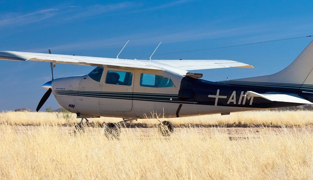 A Cessna 210Centurion after landing on a runway in the NamibRand Nature Reserve in Namibia.
