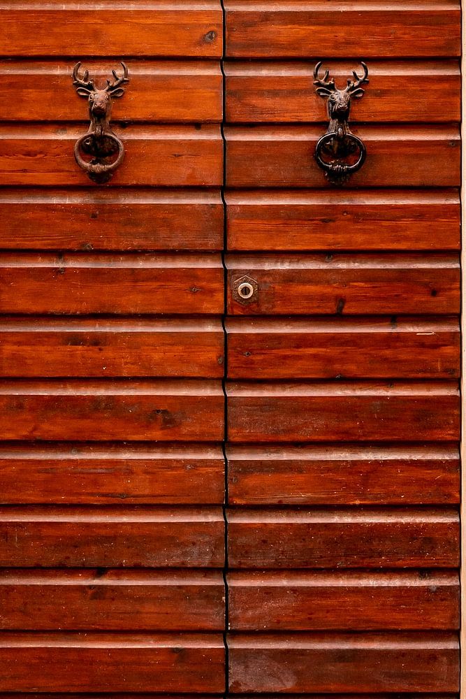 Characteristic old wooden Mediterranean door with orange plastered stone wall around it.The door is brown lacquered and has two deer heads as door knockers. The photo was taken in a small village in Italy.Photos of old doors always exude something magical. Crumbling stones, peeling paint and weathered wood make you curious about what is behind that door. Each door is unique and tells a different story.