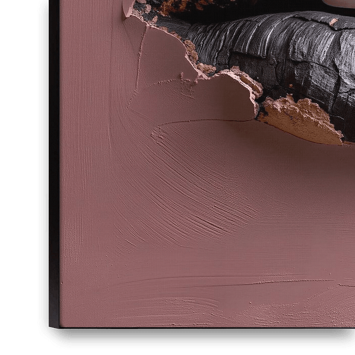 This hyperrealistic macro artwork depicts female lips as a sculptural wall relief, formed from charcoal and subtly integrated into a soft dark pink plaster wall. The slightly open mouth, with subtly visible natural teeth, gives the image an almost tangible tension and reinforces its realistic character.