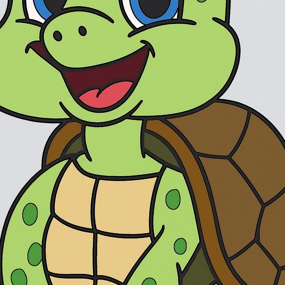 This cartoon style illustration shows an adorable baby turtle with an expressive, cheerful look. The combination of bright colours, big eyes and a seated pose…