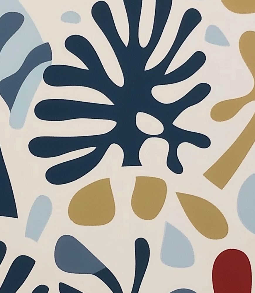 composition of organic shapes and silhouettes reminiscent of plants or coral. The shapes are simple and abstract, and vary in shades such as dark blue, red, beige and light blue. These vibrant colours are carefully distributed throughout the composition, creating a balanced yet dynamic whole. The white background gives the shapes room to breathe and emphasises the bright colours.