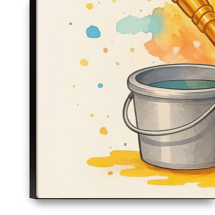 A cheerful corgi with a shiny crown holds a wide brush next to a metal bucket. Colourful paint splashes in soft pastel shades dance around it, with sparkling contrasts between warm orange and cool blue. The round eyes, friendly smile and fluffy coat create a warm, positive atmosphere. The playful whole exudes creativity and…
