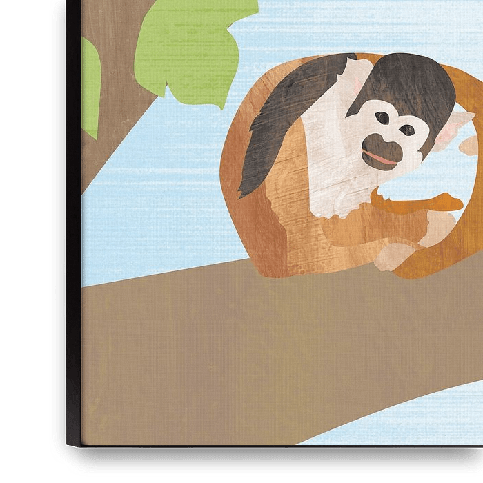 Nice illustration of three monkeys in tree branches with green leaves and blue sky. Great for the nursery!