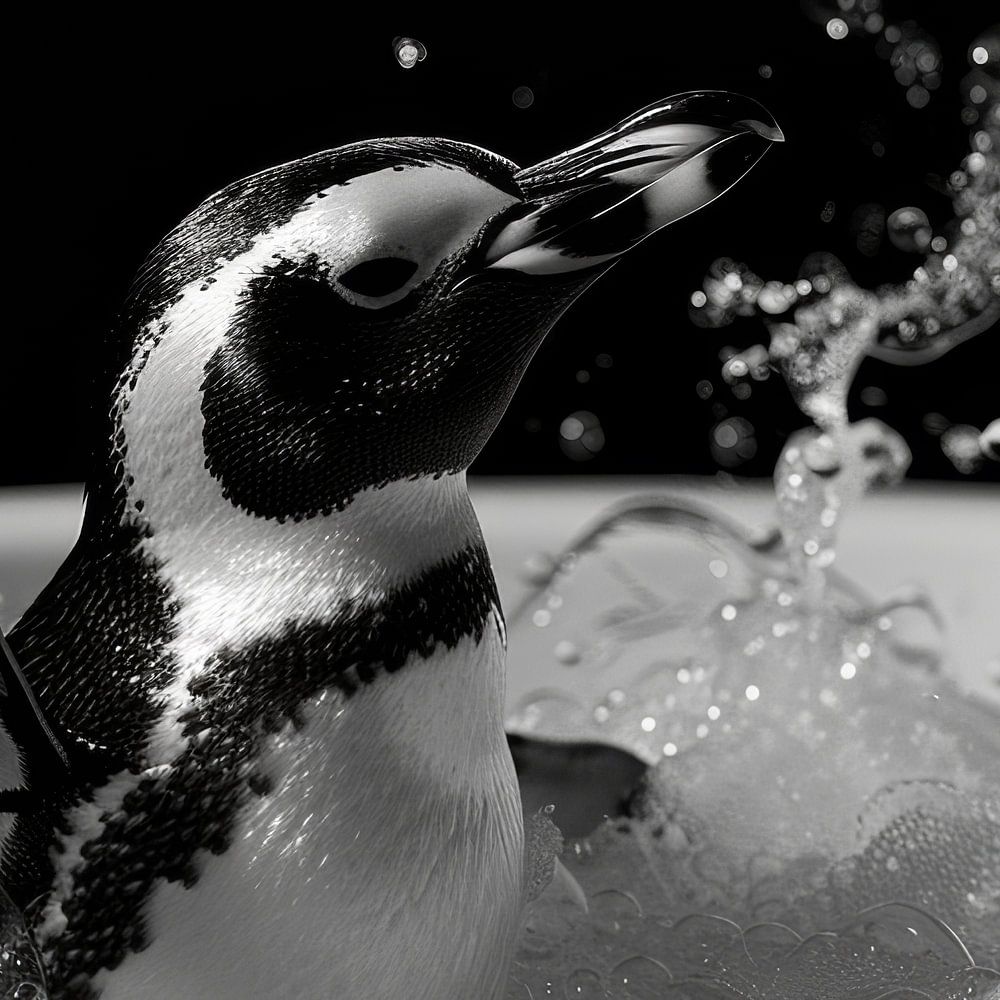 This adorable bathroom mural features a cheerful penguin splashing happily in his bathtub, adding a delightfully playful atmosphere to your toilet. The black and white photography captures the lively nature of the penguin and emphasises the details of the scene, making it a charming and unique addition to your bathroom decor. Perfect for brightening up your toilet or bathroom, it's a reminder that even cute animals can have moments of joy and fun. This modern bathroom mural series offers a refreshing decoration that will not only make you smile, but will also add a cheerful touch to your bathroom. Bring an atmosphere of lightness and joie de vivre into your WC with this charming work of art and be inspired by its exuberance.