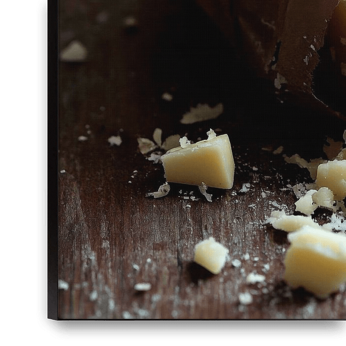 A fine piece of cheese, wrapped in rustic paper, rests on a dark wooden board. Fine crumbs are scattered around the tetrahedral masterpiece, which tantalises with its golden-brown rind and creamy texture. The scene celebrates the art of cheese-making, while the scent of maturity and tradition hangs in the air.