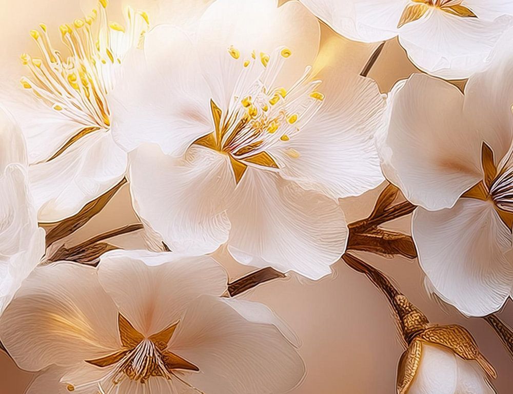 Art Print - This painting depicts the delicate beauty of white cherry blossoms against a subtle beige background, enriched with sophisticated gold accents. The fragile blossoms are depicted with great attention to detail, leaving the paint structure visible and enhancing the work's vibrant texture. The brush strokes give the artwork a unique artistic feel, with a subtle sheen adding depth and dimension.