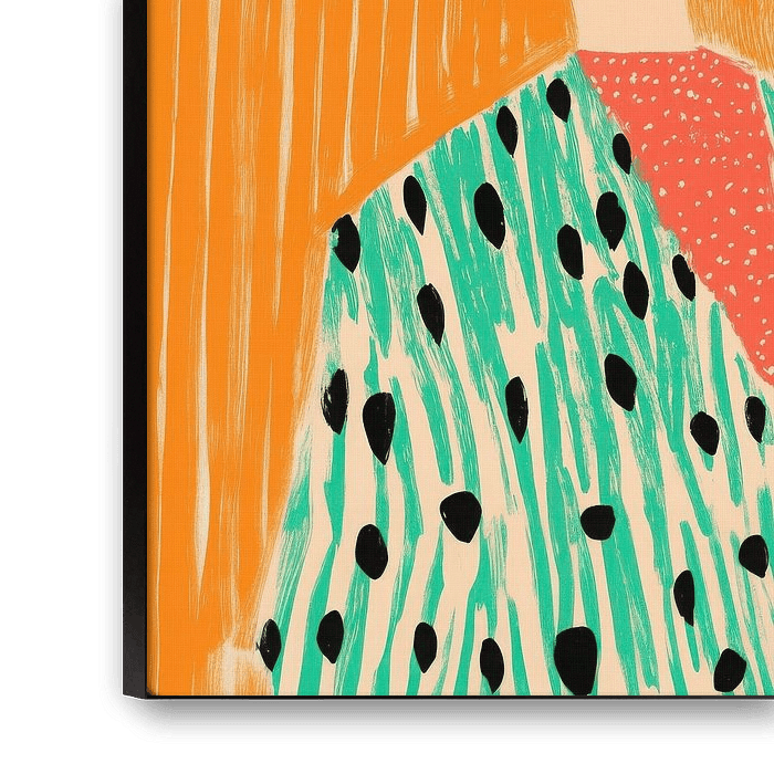 A stylised illustration of a woman with black hair tied into a high bun, wearing thick-framed black sunglasses. Her face is characterised by rosy cheeks and red lips. She is wearing a turquoise-coloured dress with vertical green stripes and black polka dots, which has a V-neck detail with pink polka dots. The background is bold orange with visible vertical brushstrokes that add texture and depth to the composition. The woman is positioned slightly to the side, looking to the right.