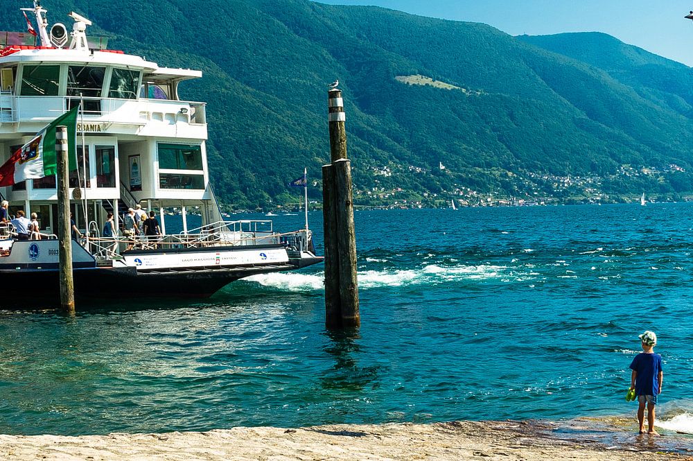 While the water from the lake washes over his feet, the child is lonely at the end of the pier looking at the ferry.