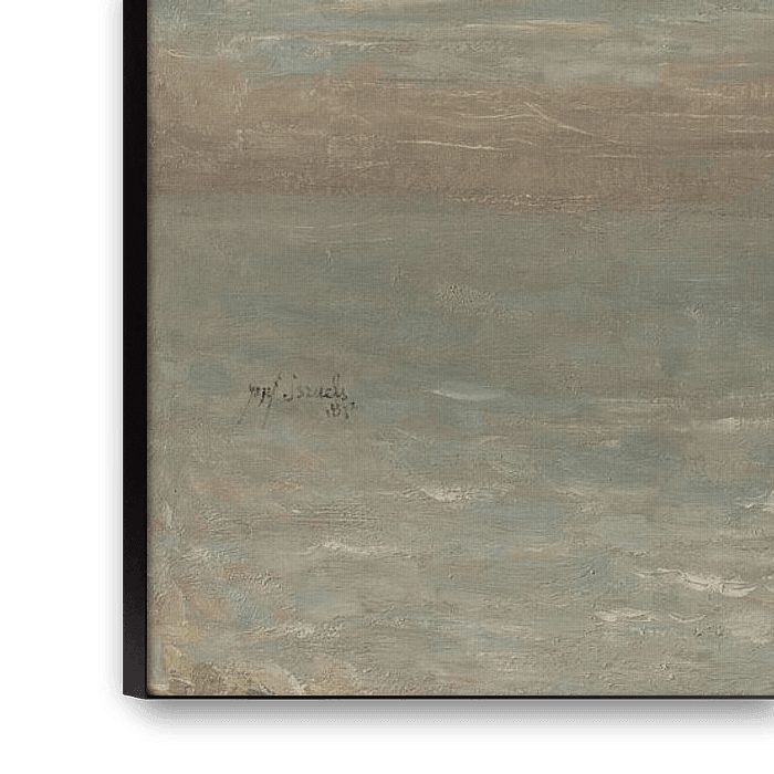 Israëls was an expert in expressing atmosphere and mood. He effectively captures the gentle, diffused light of the Dutch coast with a subdued color scheme that is characterized by earthy browns, grays, and silvery blues. The tiny individuals are dwarfed by the huge, empty sky and water, which conveys a sense of vulnerability and innocence.