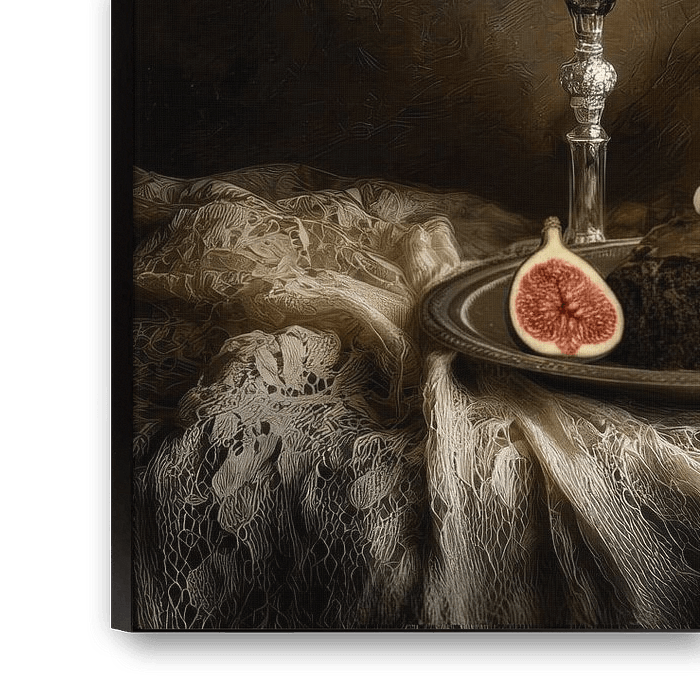 This still life with chocolate cake, figs and champagne in deep earth tones feels mysterious and elegant, bringing a warm sophistication to your interiors. The soft glow of candlelight and the play of textures evoke a sense of tranquillity and luxury. Beautifully suited to Classic, Wabi-Sabi, Grandeur Chic and Modern Chic living styles and an atmospheric addition for dining room, living room, practice room or study.