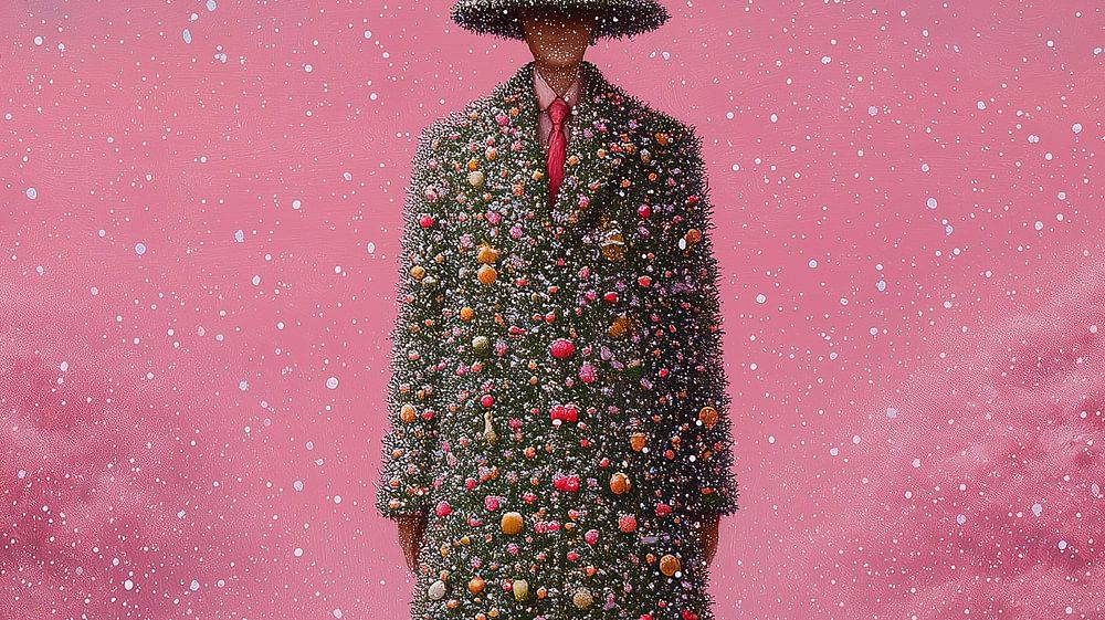 Details: kerstboom, man, kerst, sneeuw, roze, ornamenten, bomen, winter, surrealistisch, jas