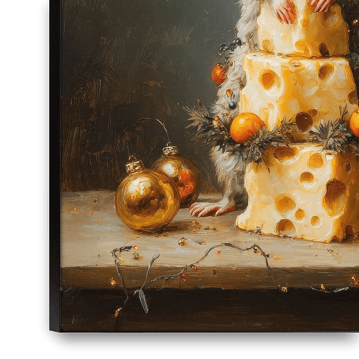 This charming artwork shows a jolly mouse standing in the middle of a playful Christmas scene. In front of him he has a pile of cheese that, with a little imagination, resembles a festive Christmas tree. Around the cheese are pine branches, garlands and shiny baubles, giving the scene a surprising and humorous character. A star even…