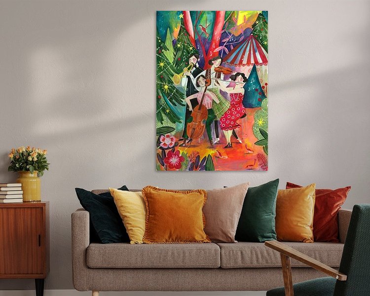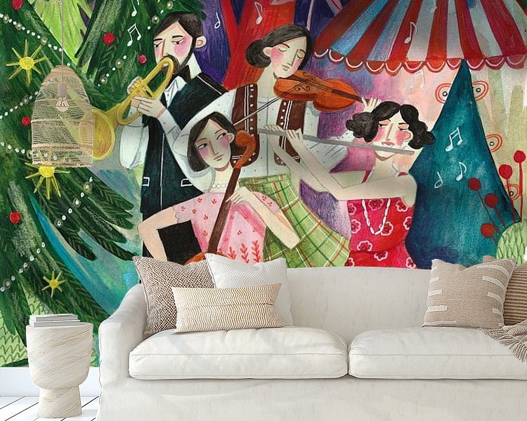 A group of four people make classical music in a fantasy forest. The pine trees are decorated for Christmas. They live in striped circus tent.