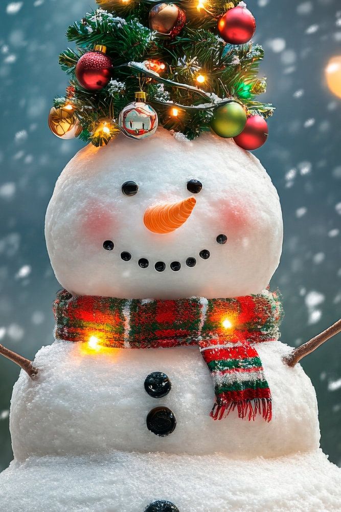 An enchanting snowman, crowned by a glittering Christmas tree and shining lights, brings wintry joy. His cheerful smile and festive decoration brighten up the cold, snow-covered landscape and create an inviting atmosphere. Perfect for the living room to spread Christmas cheer and cosiness.
