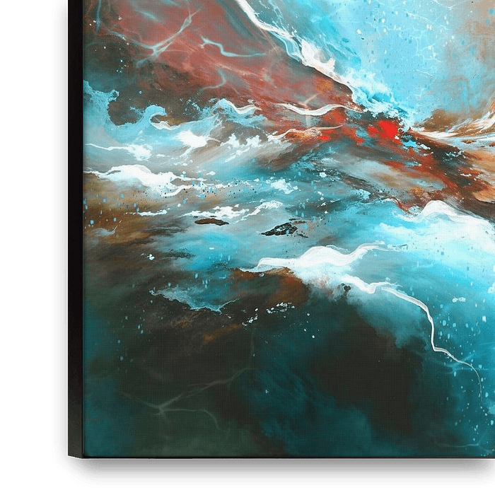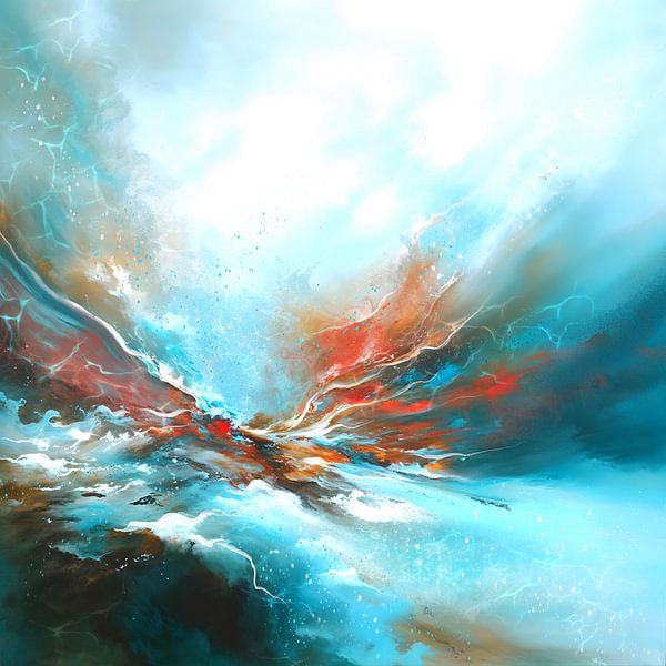 This contemporary abstract painting exudes movement and energy through powerful, flowing brushstrokes. A dynamic interplay of shades of blue and white forms the basis of the composition, enhanced by vibrant accents of red and subtle nuances of brown. In the centre, the colours converge and explode outwards, reminiscent of a natural…