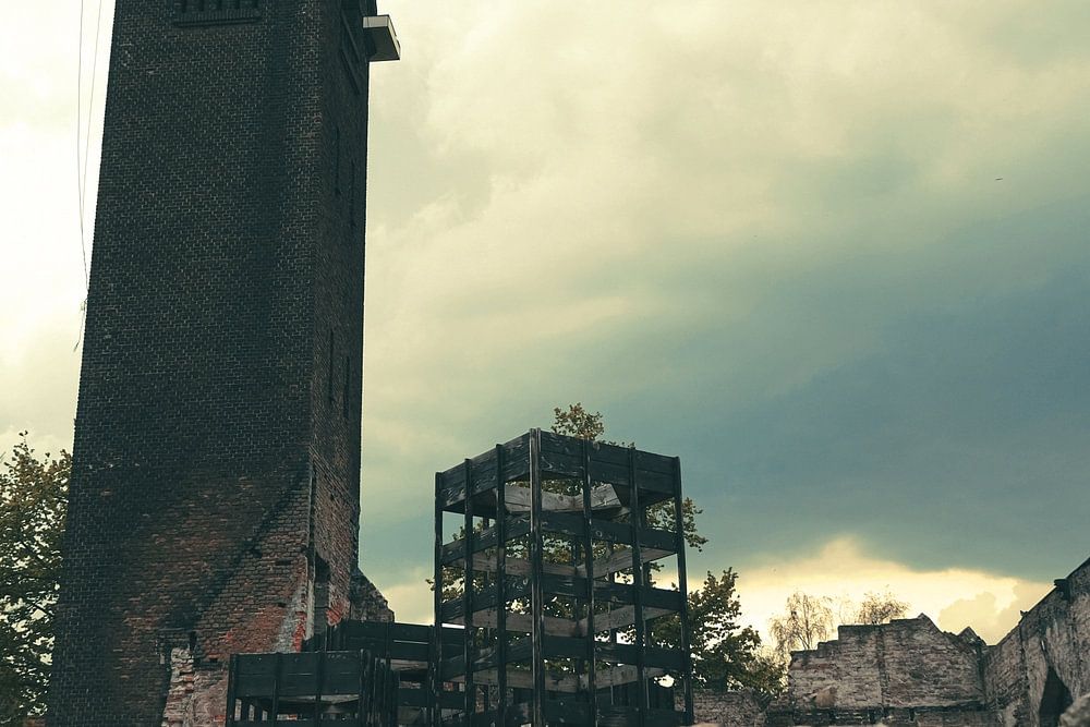 A unique view of an old church that is being demolished. The atmosphere is formed by the demolition in combination with the dark clouds.