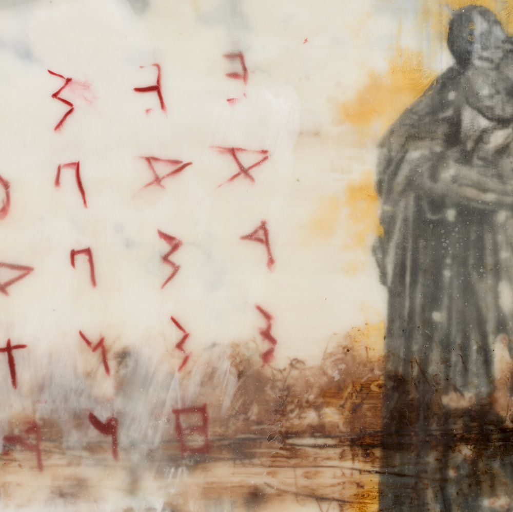 'Cipher Maria 1' is one of my earlier encaustic works. These three paintings were inspired by the idea that ancient traditions need to disguise themselves in order to survive. In these works, I created a figure of the ancient Greek version of 'Parthenos Maria'; Παρθένος Μαρία. Parthenos Maria translates to Virgin Mary.