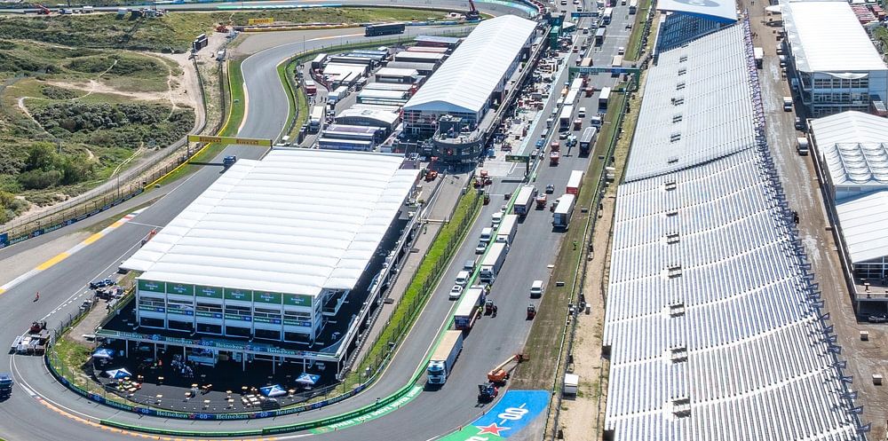 Circuit Zandvoort race track aerial view during preparations for the Formula 1 Dutch Grand Prix in the dunes at the North Sea coast in The Netherlands. The 4.259 km race track returned to the F1 calander in 2021 as the location of the revived Dutch Grand Prix and other events such as DTM, F3, Historic Grand Prix and Historic Grand Prix and ADAC GT Masters.