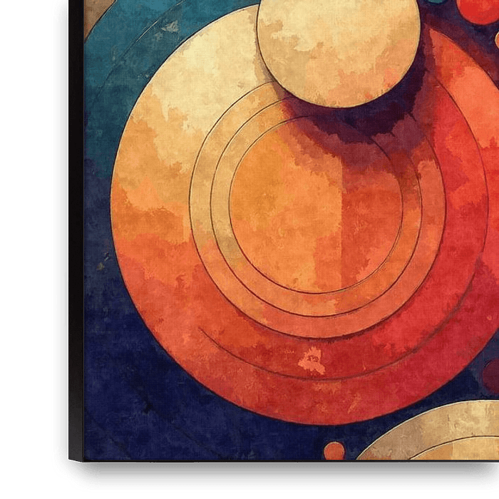 An intense, colourful motif of overlapping concentric circles that create depth, rhythm and energy. Warm and cool tones blend into a vibrant, almost three-dimensional composition. This artwork has a modern, dynamic and decorative feel – ideal for rooms that need to radiate colour, movement and graphic precision.