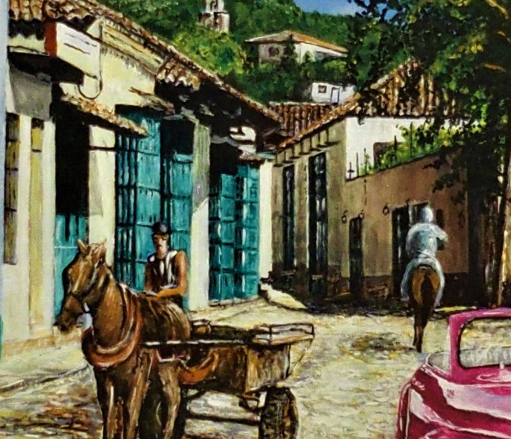 The image shows a lively street scene. In the foreground is an old pink car, next to it is a horse with a cart. In the background, several people can be seen moving on the street. The buildings along the street have colourful facades, and in the background, green trees and a blue sky can be seen. The scene exudes an atmosphere of everyday life and is painted in vibrant colours.
