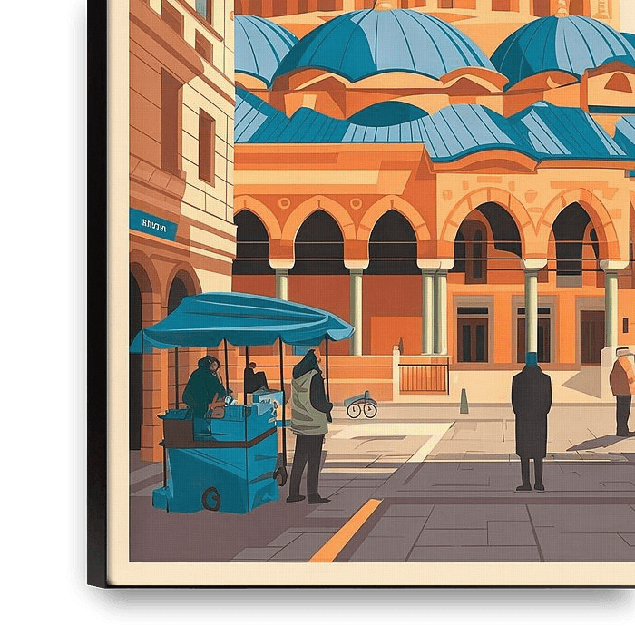 A radiant, cultural centrepiece of Sarajevo blossoms in bright colours. The magnificent mosque with its elegant curves and striking minaret attracts everyone's attention. Surrounded by charming buildings and a lively market, the scenery exudes an atmosphere of history and tradition that invites you to explore.